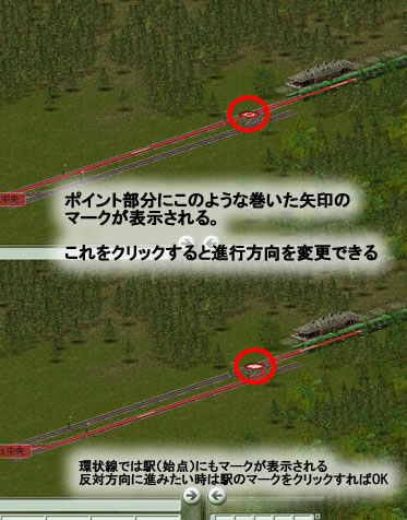 経路にポイントがあると、そこに巻いた矢印が表示されるのでクリックすると進行先が切り替わる。