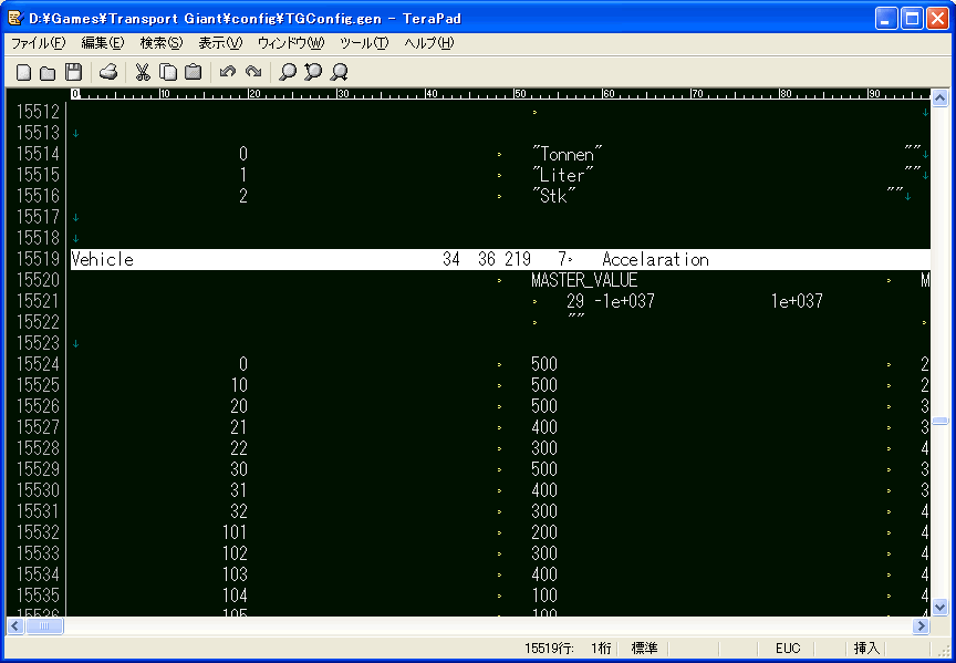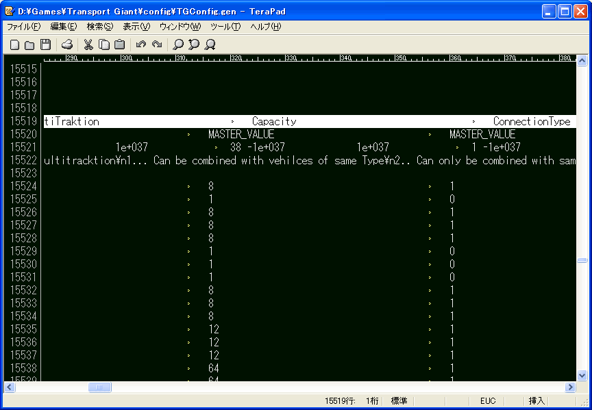 修正する箇所は、15500行過ぎあたりにある「Vehicle」で始まるブロック(ファイルによって行は微妙に変わる)。右に行くと320文字目あたりに 「Capacity」という欄があって、これが牽引可能な最大の貨車数になるので、任意の数字に変えればOK(64まで)。