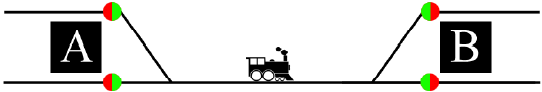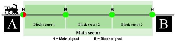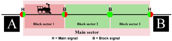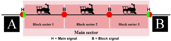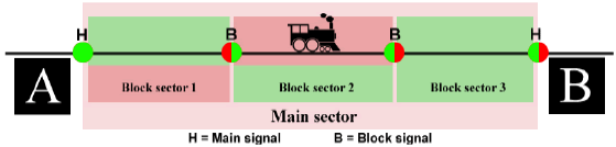 今AからBまで移動する列車、1位はブロック・セクション1を入力します。主要なブロック・セクション全体が閉鎖されます。しかしながら、列車がそこに(ブロック・シグナルによって安全になった)捜し出されないので、ブロック・セクション2は自由です。しかしながら、主要なブロック・セクションが閉鎖されるので(メイン・シグナルによって安全になった)、交通は反対の方角へ通過することができません。